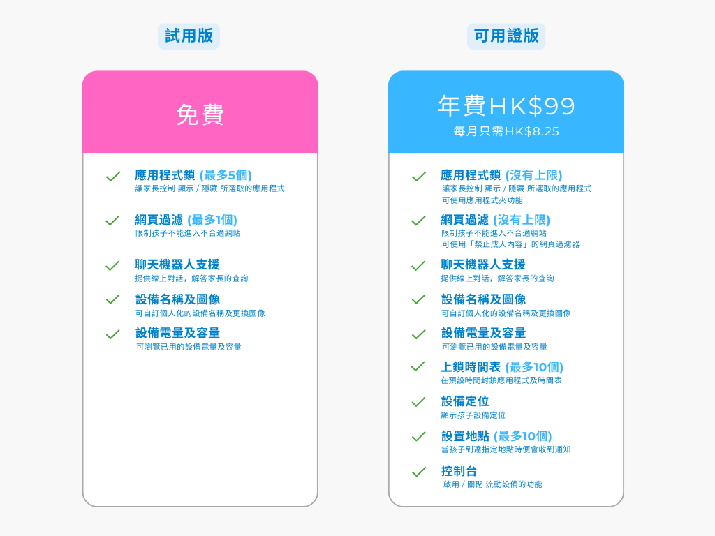 - 試用方案能讓用戶體驗部分功能,部分功能及其使用數量會出現限制和上限。如顯示或隱藏應用程式的數量上限是5個、禁止瀏覽網站的數量上限是1個、不能使用上鎖時間表及設備定位功能。